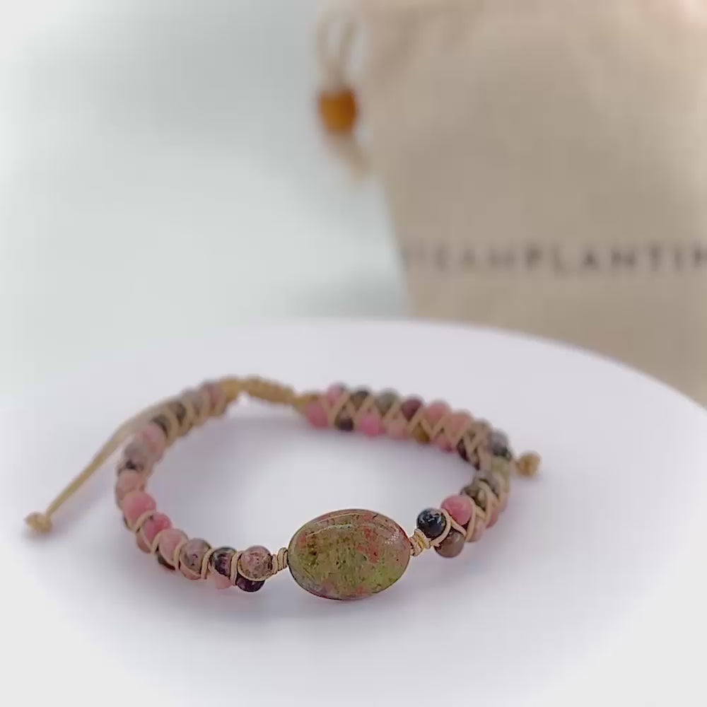 With its tender and loving energy, the Lovers Stone Bracelet clears the Solar Plexus Chakra, the center of your emotions and willpower. Rhodonite enables you to confront internal negative feelings such as anger, guilt, and pain while radiating a healing energy that is strongly resonant with forgiveness, and fills your soul with pure love.